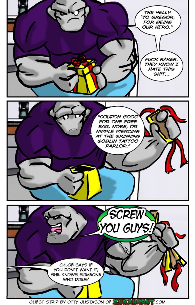 Today’s guest comic is by Otty Justason, creator of Zukahnaut, a fun little yarn about a giant alien ogre come to earth! Wait a minute……. Also, it’s the only place I’ve seen an onomatopoeia contain the word “potato.” I’ve finished[…]↓ Read the rest of this entry…